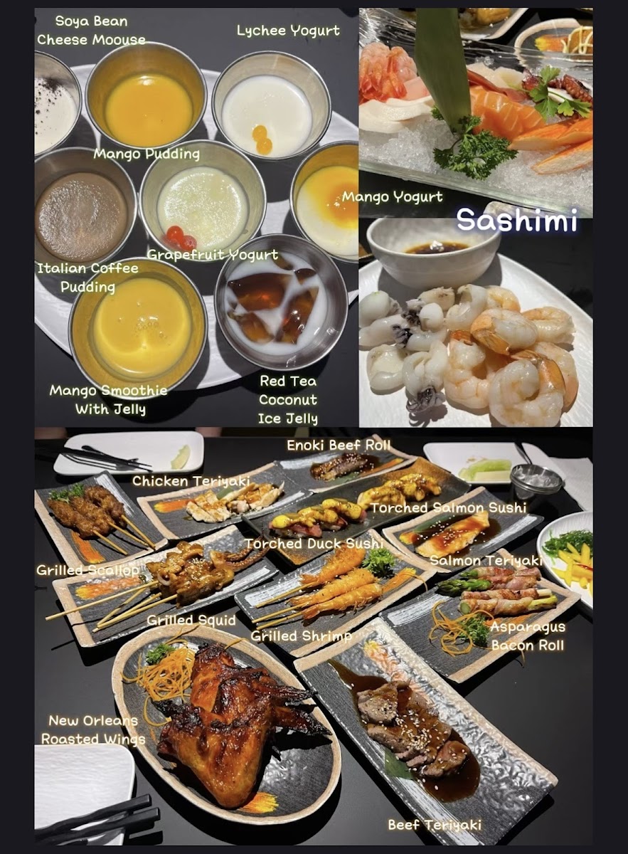 In addition to the main sushi and grilled selections, the menu includes a salad bar with customizable seasoning and sauce choices, as well as Asian-inspired appetizers like baked mussels with cheese and mango salad. The buffet structure allows diners to sample a wide range of items, including fried foods, skewers, noodles, and soups, accommodating both casual dining and larger group meals.